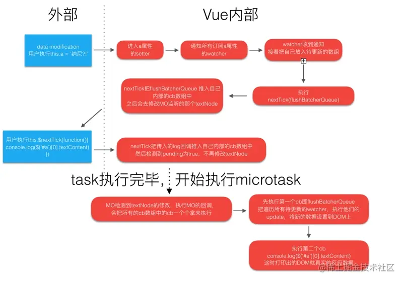 Vue的nextTick api的实现部分是Vue里比较好理解的一部分,与其他部分的代码也非常的解耦,因此这一块的相关源码解析文章很多。我本来也不准备单独写博客细说这部分,但是最近偶然在别人的文章中了解到: