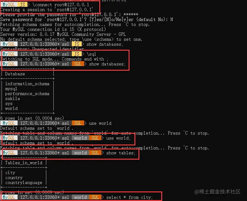- 连接成功后输入"\sql" 进入sql命令模式;