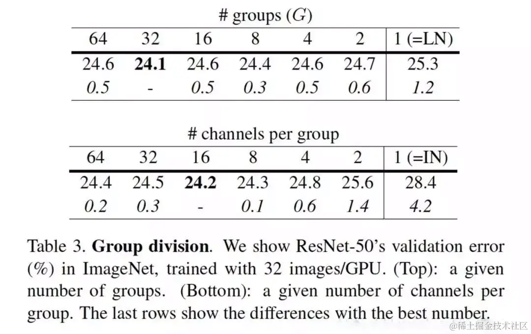 - 第一个表格展示GN的group Number不断减小,退化成LN的过程。其实,分组32个group效果最好;