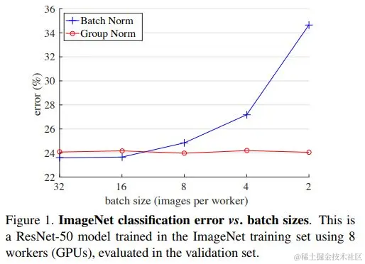 下图是比较BN和GN在Batch Size越来越小的变化中,模型错误率变化的对比图: