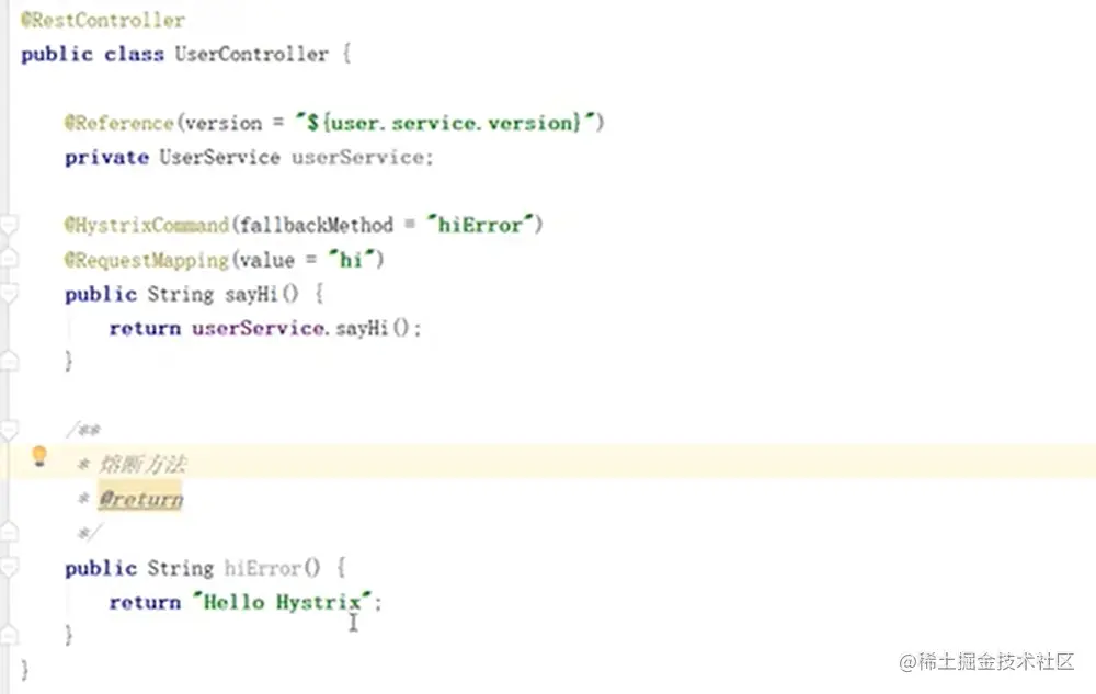 @HystrixCommand(fallbackMethod="hiError"),调用服务出现错误时,熔断机制开启时返回的错误信息,hiError为定义错误信息返回的方法名 -