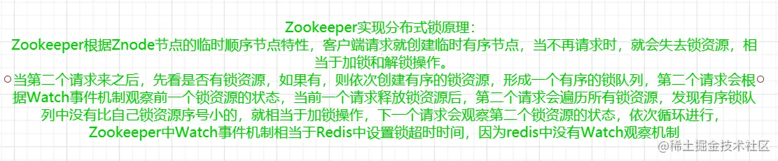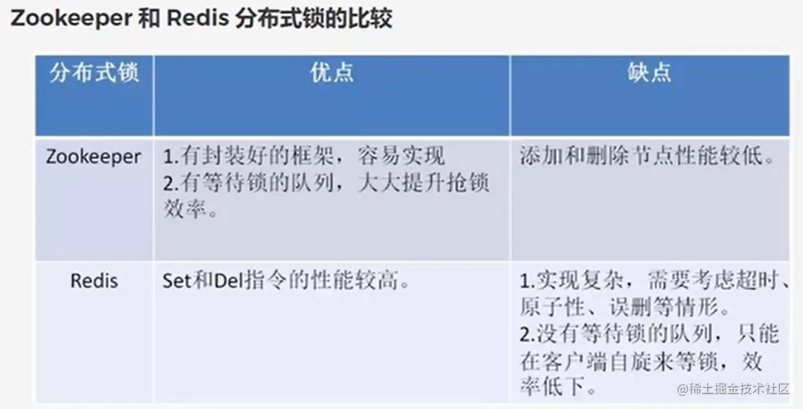 Redis实现分布式锁需要自己编写代码实现,而Zookeeper通过自身的顺序临时节点来实现分布式锁和等待队列。