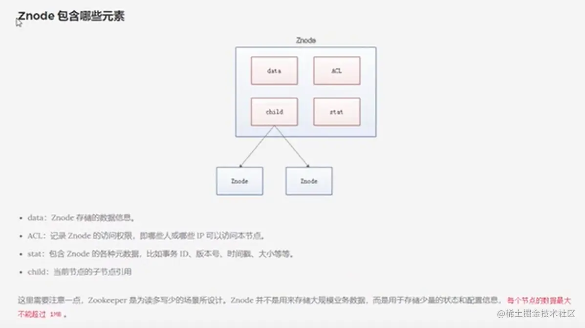 Zookeeper适用于读多写少的场景,Znode并不是用来存储大规模数据,而是用于存储少量的状态和配置信息,每个节点的数据量不能超过1Mb
