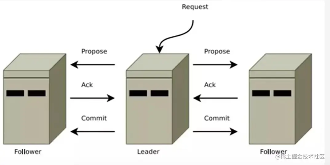 Leader主节点采用二阶段提交方式,先发送Propose广播给所有的Follower从节点(准备写数据,开启事务,开启一阶段提交)