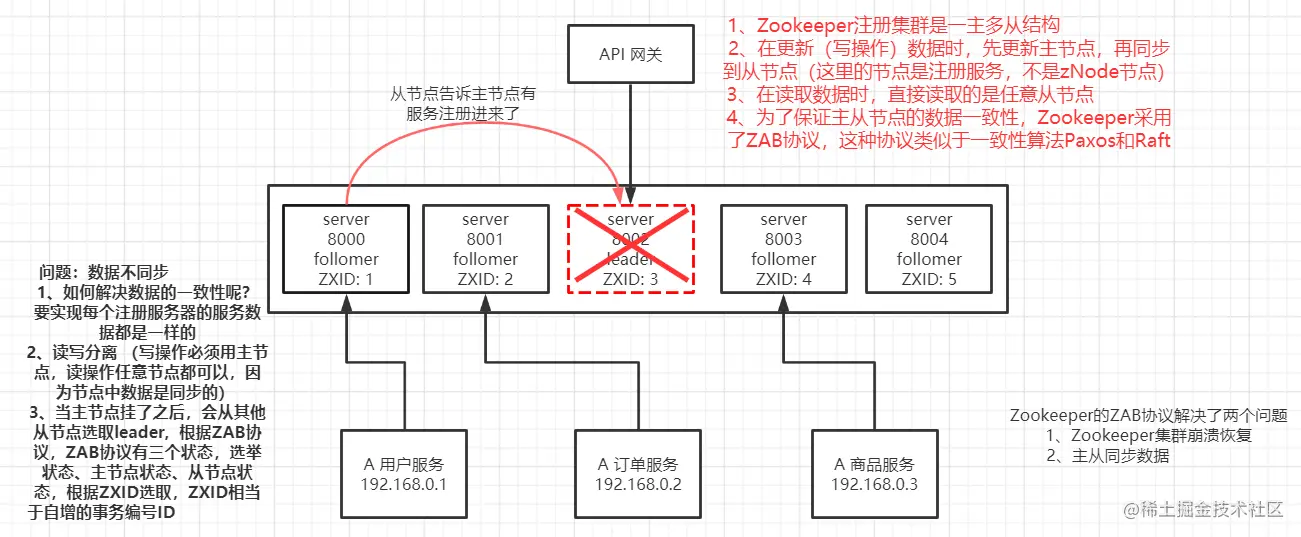 Zookeeper采用CP保证数据的一致性问题,原理采用ZAB原子广播协议,当我们的zk领导者leader因为某种原因宕机的情况下,会自动触发重新选一个新的领导角色,整个选举的过程为了保证数据的一致性问题,在选举的过程中整个zk环境是不可以使用,可以短暂可能无法使用zk,意味着微服务采用该模式的情况下,可能无法实现通讯。(本地有缓存除外)注意: 可运行的节点必须满足过半机制,整个zk才可以使用
