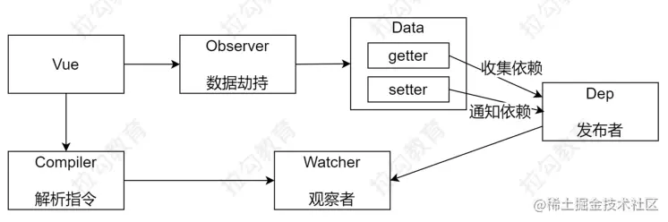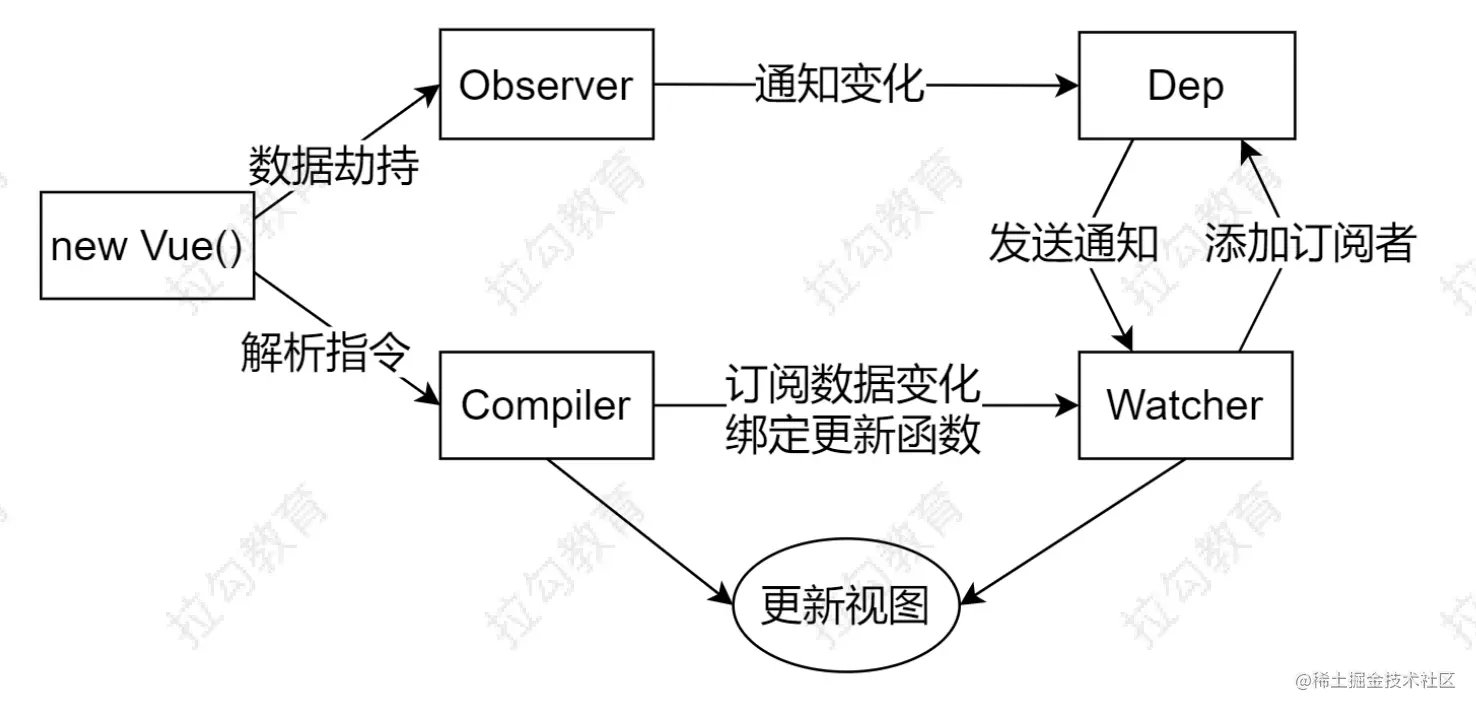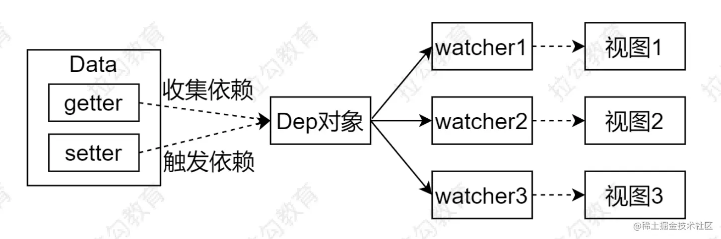 - 当数据变化触发依赖, dep 通知所有的 Watcher 实例更新视图