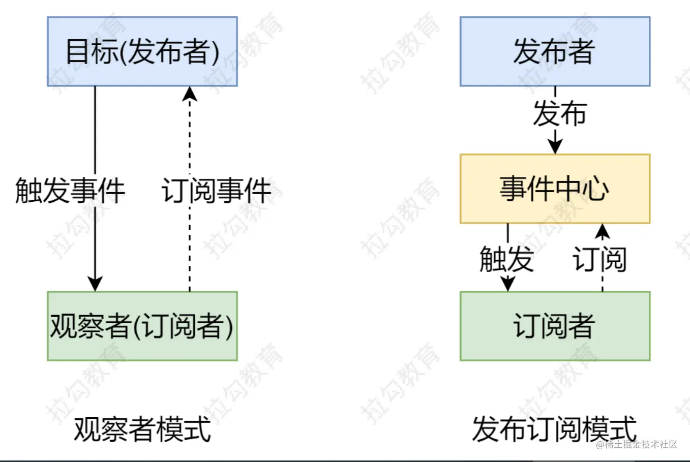 观察者模式是由具体目标调度,比如当事件触发,Dep 就会去调用观察者的方法,所以观察者模 式的订阅者与发布者之间是存在依赖的