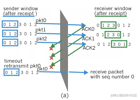 pkt0,pkt1和pkt2,在 reseiver 再次收到这三个包的时候,pkt1和pkt0就和发送的数据在原始数据中的位置是不对应的,即 sender 和 receiver 两个窗口中的相同序号的位置和数据的原始位置不一致