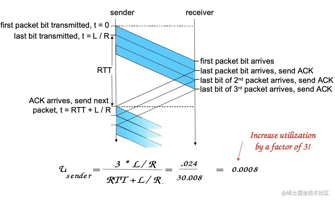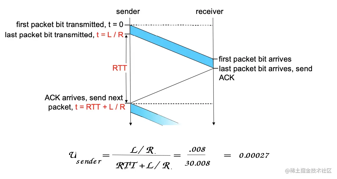 在使用 stop-and-wait 进行数据传输的过程中,传输效率是极低的,即使拥有较高速度的宽带,时间也大都在等待的时间过程中浪费掉了。