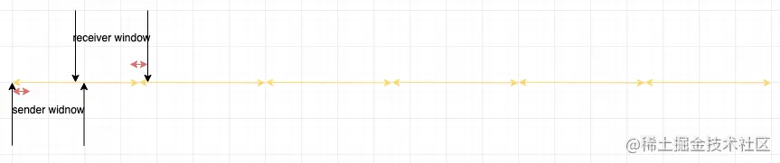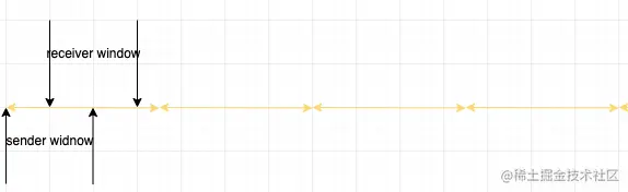 会不会是 sender 发送的包丢失导致的?不会,因为 sender 发送的数据丢失了,receiver 也就不会接收到数据了,sender 和 receiver 的窗口都不会移动。也就是说 sender 的窗口是滞后于 receiver 的窗口的。如果两个窗口放在一个数据上,就可以如下图,黄色的双向箭头可以理解为一段长度为N的序列。