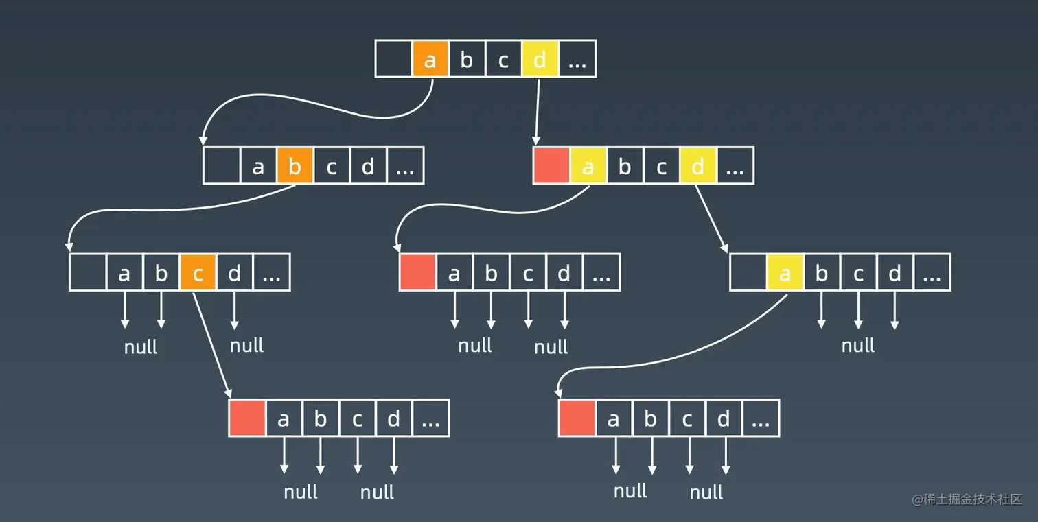- Trie 树的核心实现是空间换时间。