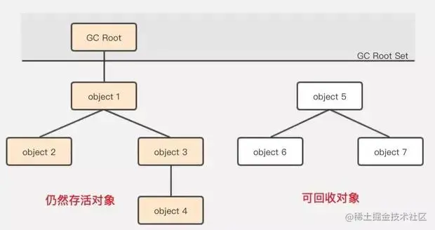 通过GC ROOT的对象作为搜索起始点,通过引用向下搜索,所走过的路径称为引用链。通过对象是否有到达引用链的路径来判断对象是否可被回收(可作为GC ROOT的对象:虚拟机栈中引用的对象,方法区中类静态属性引用的对象,方法区中常量引用的对象,本地方法栈中JNI引用的对象)