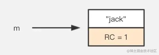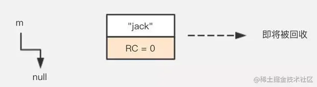 先创建一个字符串,String m = new String("jack");,这时候 "jack" 有一个引用,就是m。然后将m设置为null,这时候 "jack" 的引用次数就等于 0 了,在引用计数算法中,意味着这块内容就需要被回收了。
