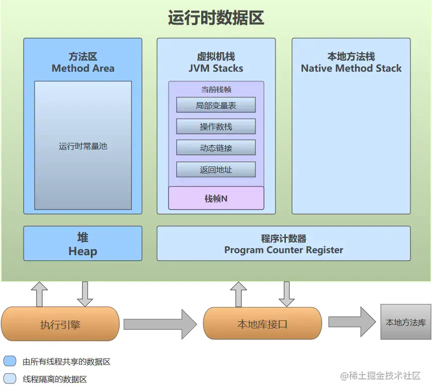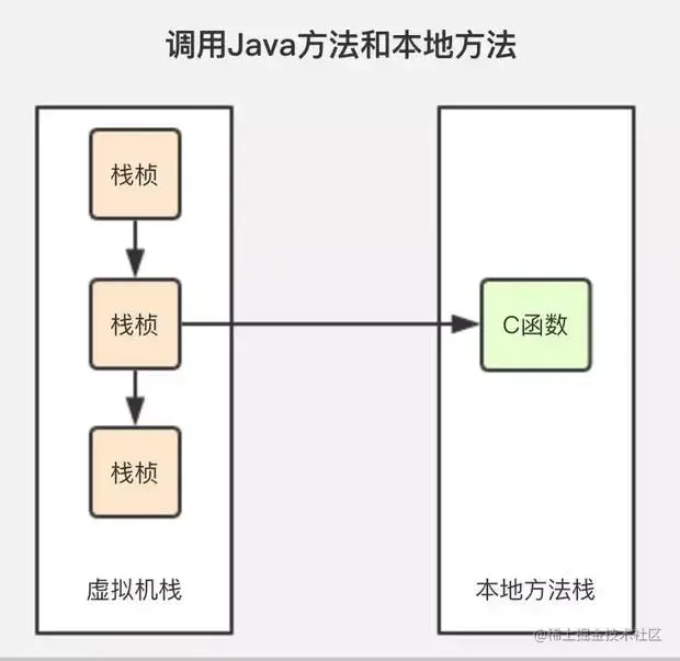 任何native接口都会使用某种本地方法栈,实现的本地方法接口是使用C连接模型的话,那么它的本地方法栈就是C栈。当线程调用Java方法时,虚拟机会创建一个新的栈帧并压入Java栈。然而当它调用的是本地方法时,虚拟机会保持Java栈不变,不再在线程的Java栈中压入新的帧,虚拟机只是简单地动态连接并直接调用指定的本地方法。