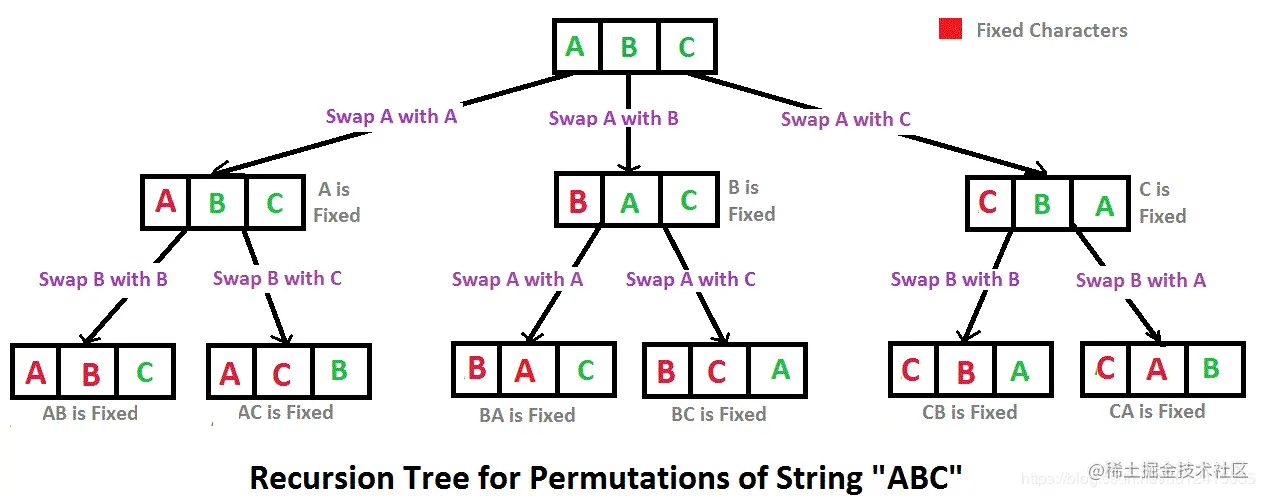 首先,将第一个字符与后面字符依次交换位置,然后固定第一个字符,再将后面的字符重复上述操作,直到字符串末尾。过程如下