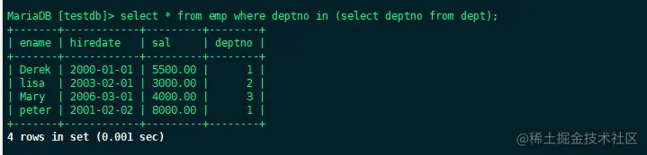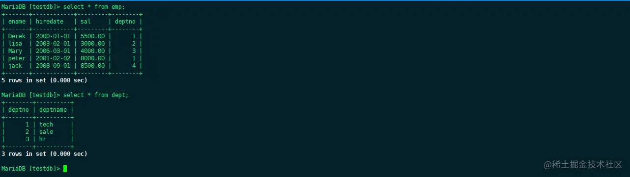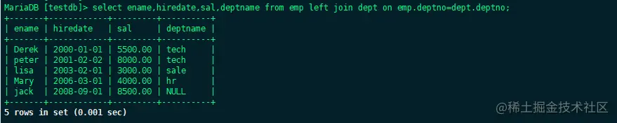 这样子就利用部门编号这个两个表中共有的字段将两张表连接在了一起,查看到了所有的数据,但是会发现emp里面的jack这个人并没有显示出来,这是因为他的部门编号为4,是一个非法的,不存在于dept表中的数据,所以只显示交集。