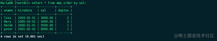 如果需要对数据的某个字段进行排序,那么需要用到order by关键字, 比如说按照工资从低到高排序。