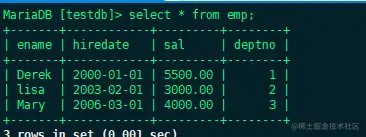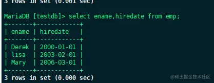 也可以用逗号分隔开不同的字段,上面的语句表示只查询ename和hiredate两个字段.