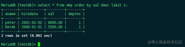 如果对于排序后的结果只需要显示出一部分的话,可以用limit关键字;比如显示出工资最高的两个人。