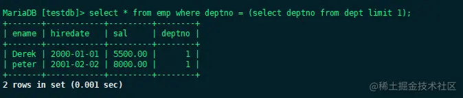 select * from emp where deptno = (select deptno from dept limit 1);