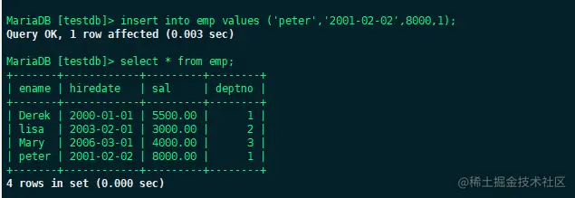 insert into emp values ('peter','2001-02-02',8000,1);