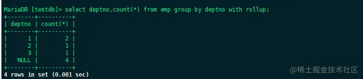 select deptno,count(*) from emp group by deptno with rollup;