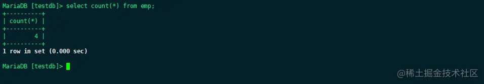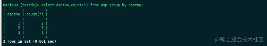 可以看到目前公司里只有可怜的4个人。那么进一步,想知道每个部门有多少人的话,输入下面的语句: