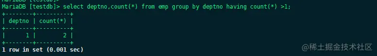 有时用户并不需要所有的数据,而是按照一定条件筛选过后的数据,使用where关键字可以实现这样的操作。比如查询部门编号等于1的记录。