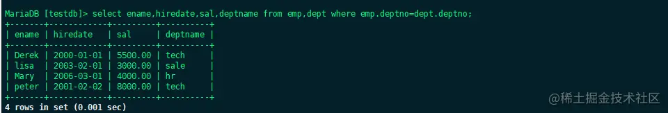 select ename,hiredate,sal,deptname from emp,dept where emp.deptno=dept.deptno;