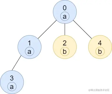 解释:节点 0 的标签为 'a' ,以 'a' 为根节点的子树中,节点 2 的标签也是 'a' ,因此答案为 2 。注意树中的每个节点都是这棵子树的一部分。
