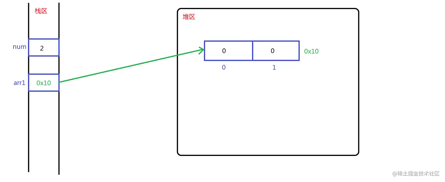 ②程序运行时,局部变量存放在栈区,对象和数组存在堆区。(基本类型和引用类型都是在栈中声明,区别在于基本类型保存的是值,而引用类型保存的地址,所以直接打印arr1会打印出一个地址)