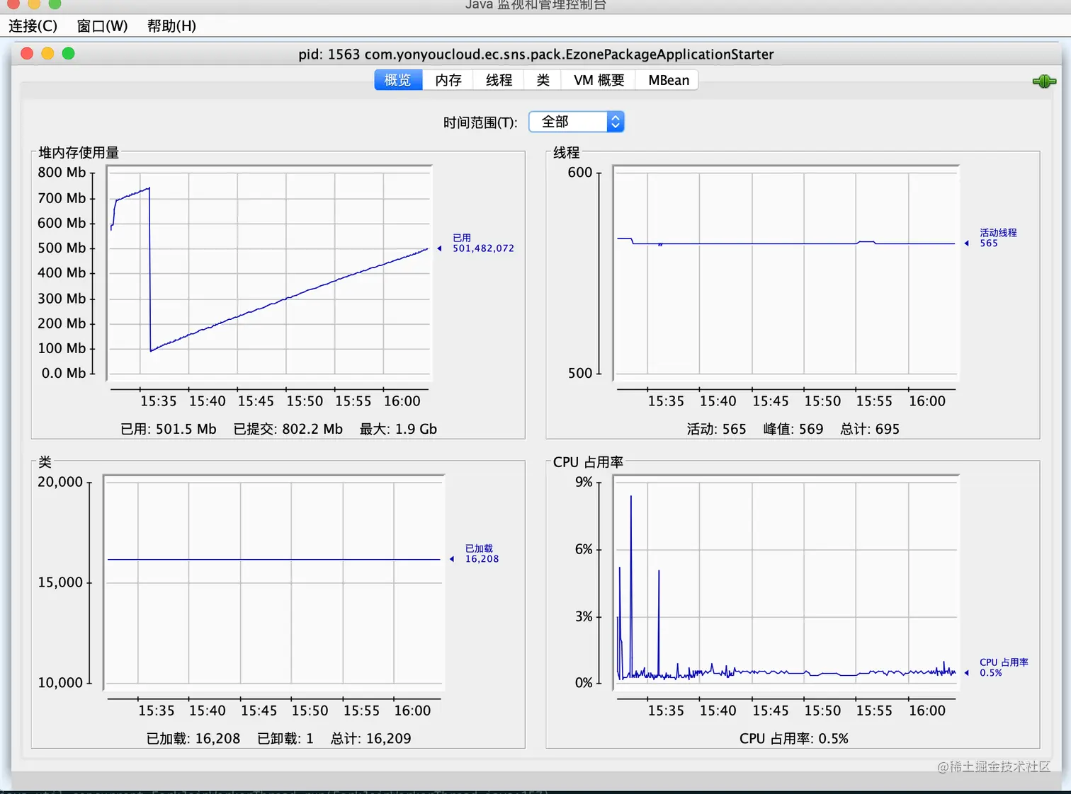 从上面看出,第一个线程是执行python脚本的线程,处于runable状态,第二个线程是获取process的inputStream流信息,也是处于runnable状态,这么看并没有任何问题。下面看一下堆内存的使用情况: