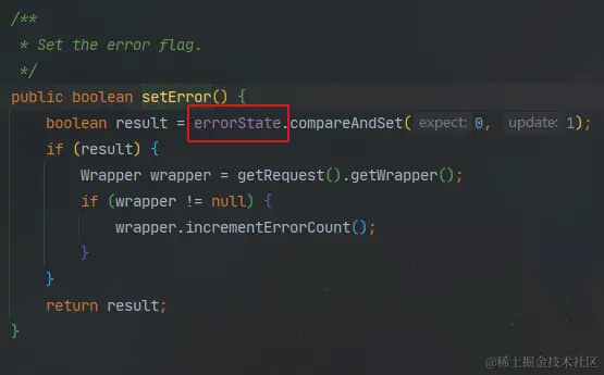 cas方法进行对一个状态值errorState设置为1 ,正是这状态值让后续的异常处理决定是否再次调用<error-page>的配置进行处理,再看下setStatus()方法一目了然