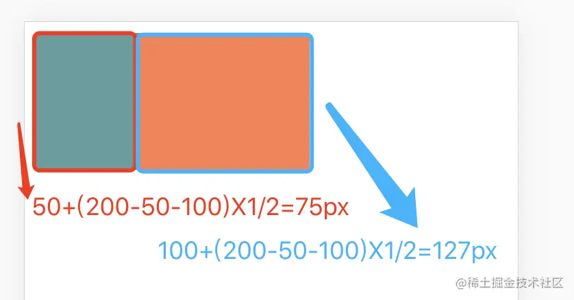 父元素的宽是200px,子元素1是50px,子元素2是100px。将flex-grow都设置为1。