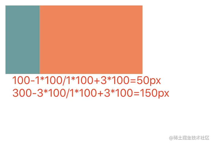 父元素宽为200px,子元素1是100px,子元素2是300px,溢出200px。flex-shrink都为1