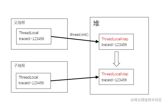 - 先将ThreadLocal的内容保存在堆中,再子线程中将堆中的内容复制过来