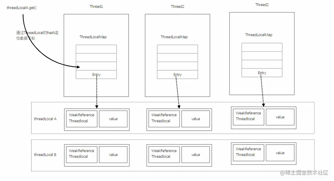 ThreadLocal实现结构以及执行的过程如下图所示。