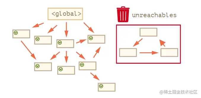 不过3者与外界的连接断了,形成一个环互相引用,而外界无法引用时,就会被算做垃圾