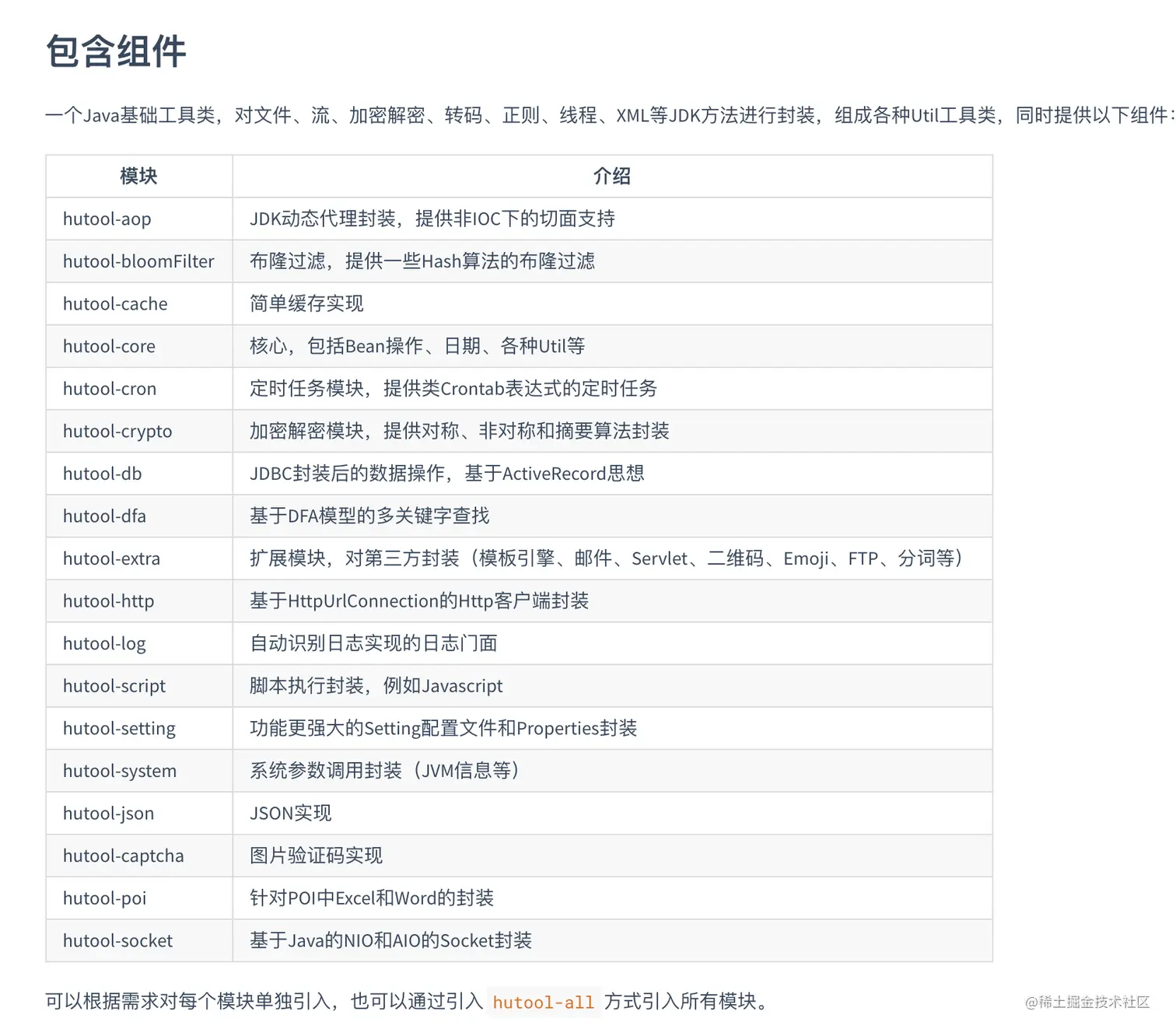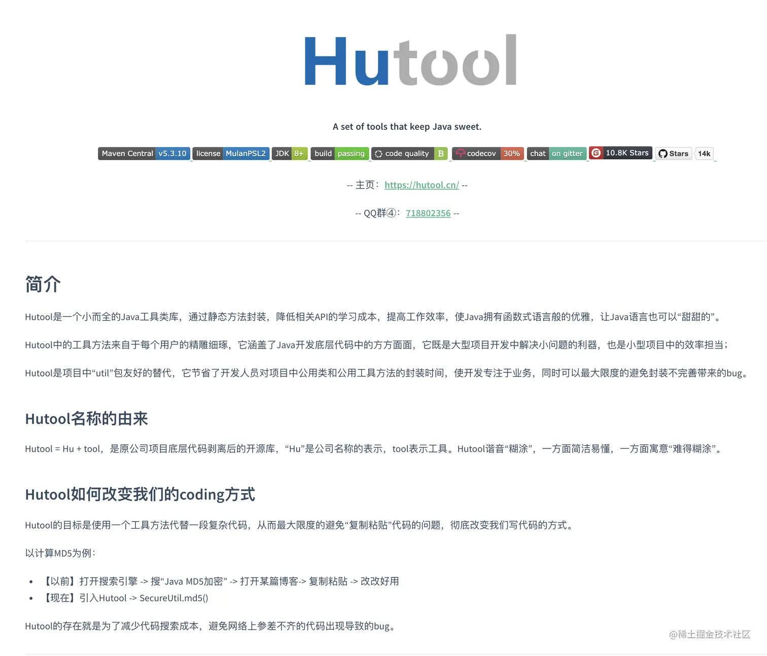 一开始接触这个项目的时候,初看官网的介绍,就被该简介以及包含的组件勾起了好奇心,而当我看到「Hutool 是如何改变我们的 coding方式」的时候,哈哈哈,内容过于真实,仿佛看到了当初那个在深夜为了某个简单的工具代码徘徊在 Google/百度 搜索引擎前的自己。