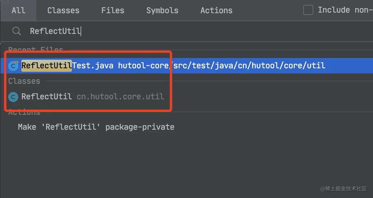 从代码结构图可以看出,是一个简单的聚合项目,每个子 Module基本上对应上述表格中的一个组件,我选择从 core这个模块开始阅读,里面包含整个工具库的核心工具代码,到了具体的代码层面,作者很贴心的为每个工具类都写了单元测试类,我们阅读过程中可以直接使用单元测试类来调试源码,直接搜索一下就能看到对应的测试类:
