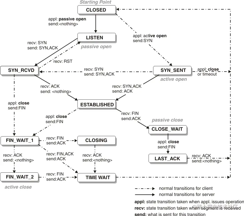 - 如果Client(客户端)直接CLOSED(关闭),然后又再向Server(服务器端)发起一个新连接,我们不能保证这个新连接与刚关闭的连接的端口号是不同的。也就是说有可能新连接和老连接的端口号是相同的。一般来说不会发生什么问题,但是还是有特殊情况出现:假设新连接和已经关闭的老连接端口号是一样的,如果前一次连接的某些数据仍然滞留在网络中,这些延迟数据在建立新连接之后才到达Server,由于新连接和老连接的端口号是一样的,于是,TCP协议就认为那个延迟的数据是属于新连接的,这样就和真正的新连接的数据包发生混淆了。所以TCP连接还要在TIME_WAIT状态等待2倍MSL,这样可以保证本次连接的所有数据都从网络中消失。