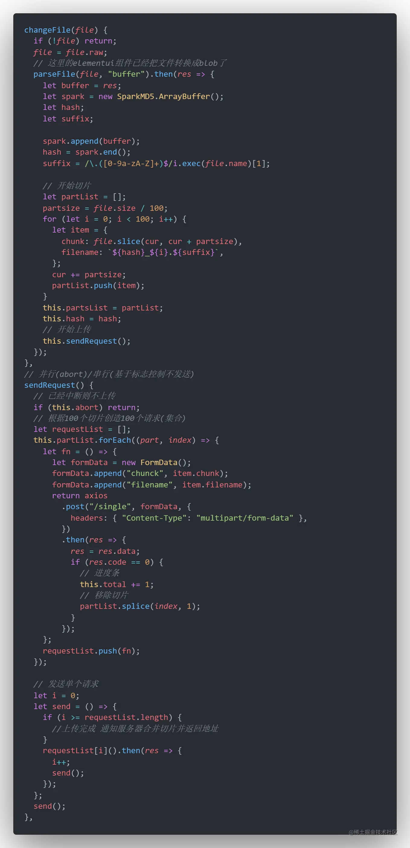 file对象是继承blob的,因此可以获取到ArrayBuffer,ArrayBuffer类对象有与普通数组一样的方法,因此通过slice方法截取数组就可以将文件切片(chunk)了。