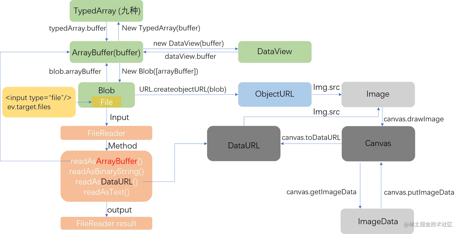 TypedArray,Blob(File),DataView,image,Canvas之间可以相互转换。