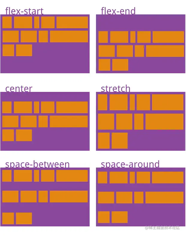 space-around:每个项目两侧的间隔相等。所以,项目之间的间隔比项目与边框的间隔大一倍。