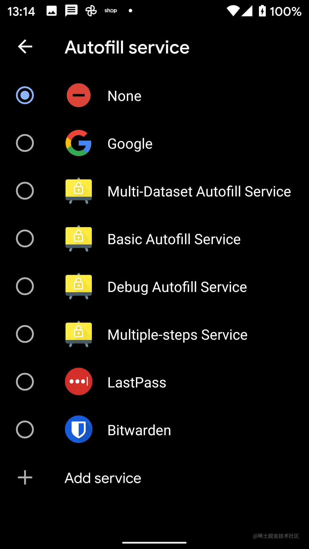 你可能已经有了一些自动填写服务(如LastPass、Bitwarden),也可能没有。无论哪种情况,建议你在开发过程中不要使用它们,而是使用服务的参考实现。按照本 CodeLabs 第 1 步的指示,在设备上设置 Android 自动填充框架示例。