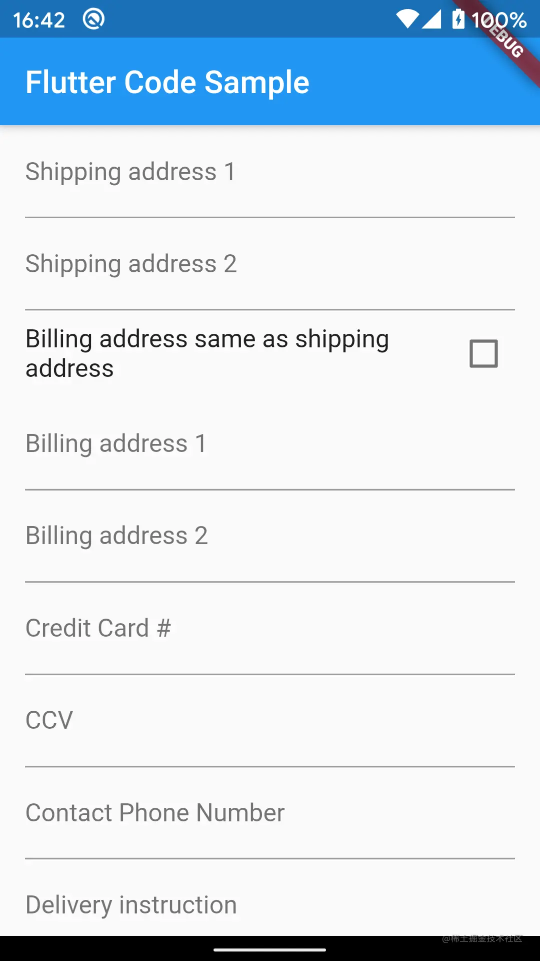 在这一点上,我们可以很满意我们的应用程序。但是,电话号码通常是和送货地址一起填写的。换句话说,电话号码字段应该与地址行1和地址行2在同一个AutofillGroup中。但是,在我们的widget中,这就不太容易了,因为,在中间,我们还有账单地址字段。