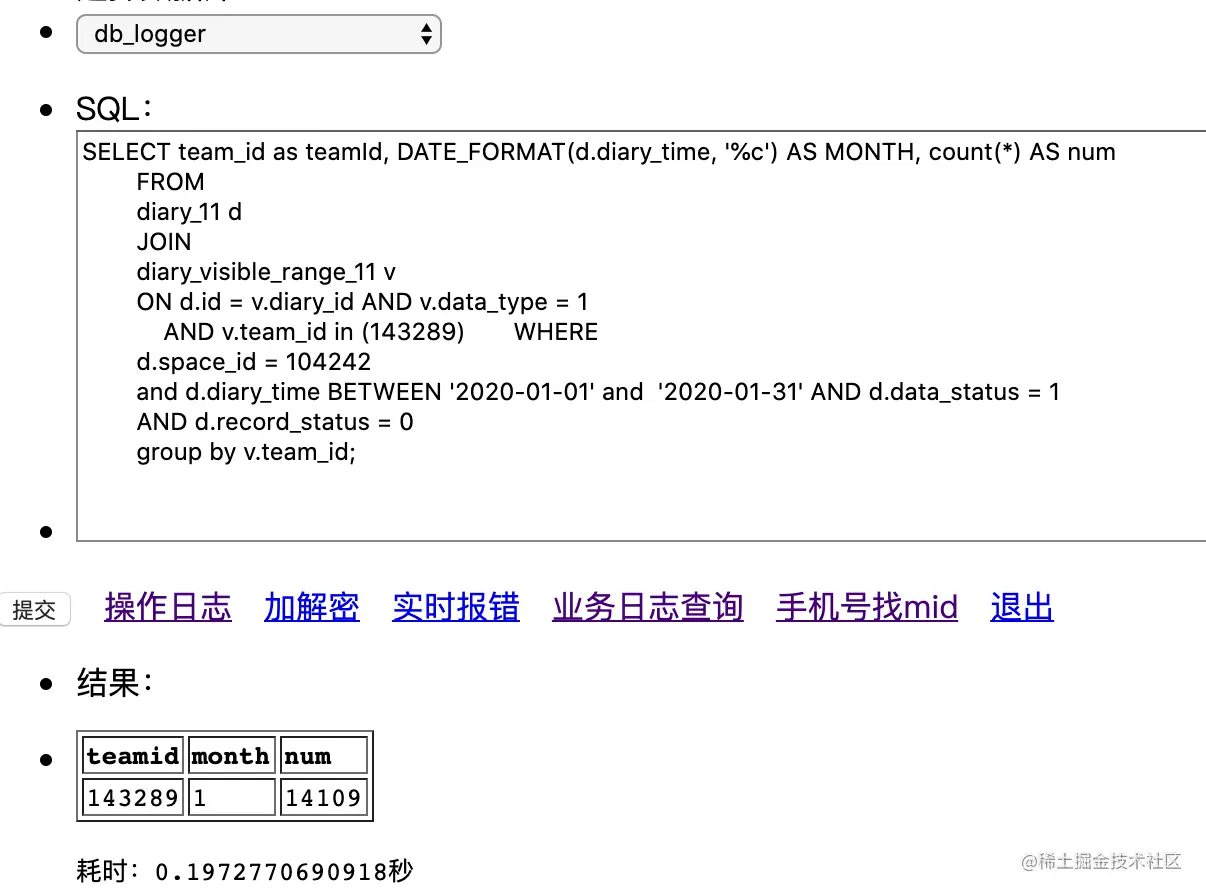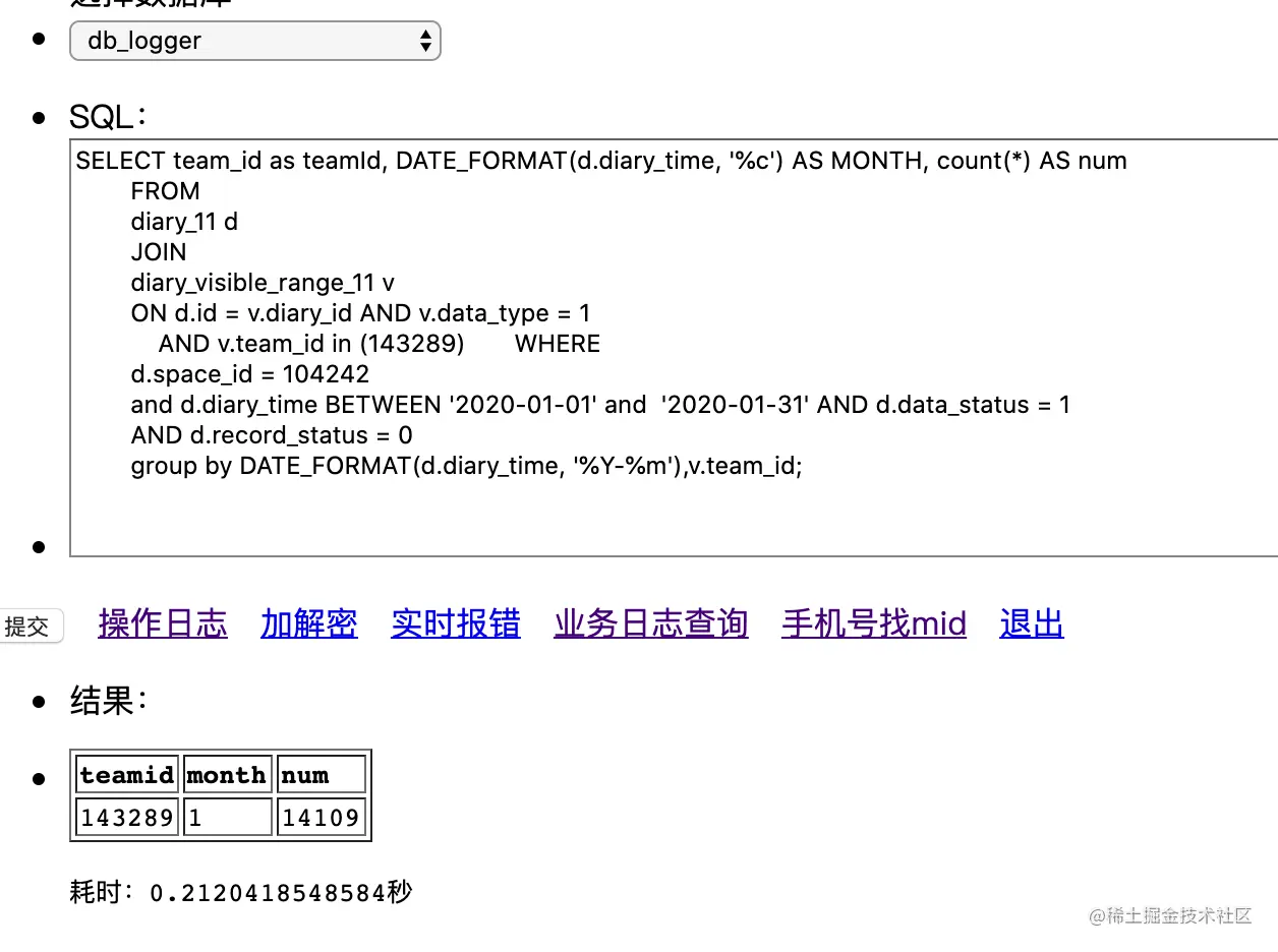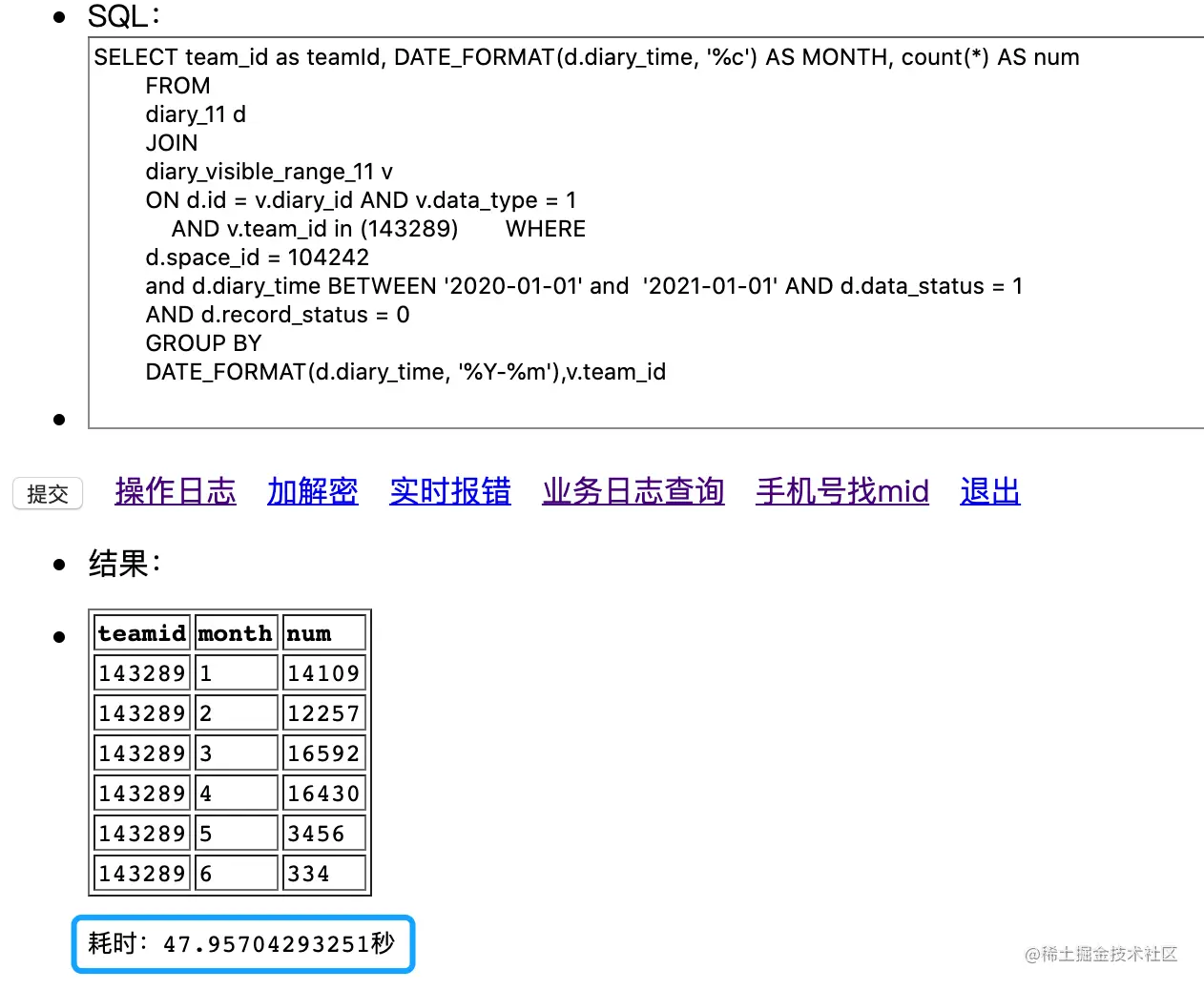 可以看到两张表是通过 diary.id关联,筛选条件是diary_visiable_range 表目标为team_id,在一年中的按月统计记录。