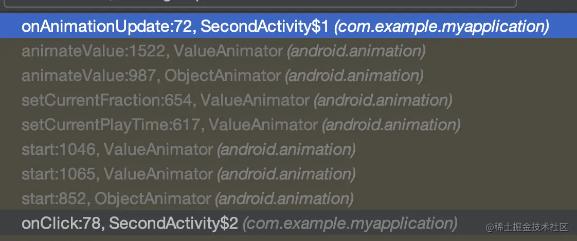 可以看出其调用路径,一层一层的回溯,先看ValueAnimator#animateValue()方法(由于ROM厂商可能修改源码,故行数与SDK中行数可能不一致):
