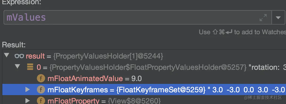 再次通过Debug功能,如上图所示,mFloatKeyframes是FloatKeyframeSet: