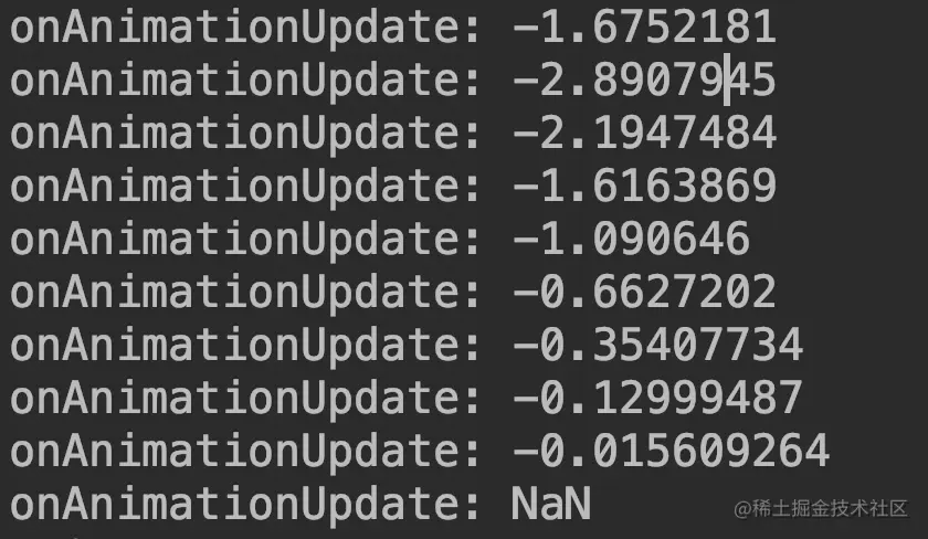 很明显,由于动画中值是NaN,故设置给View的Roation属性便是NaN了。